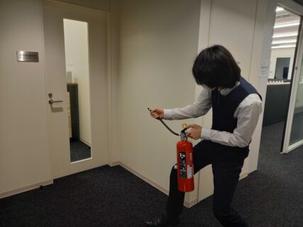 その後、火災を発見した際の消火器を用いた消火の方法の説明を受けました。